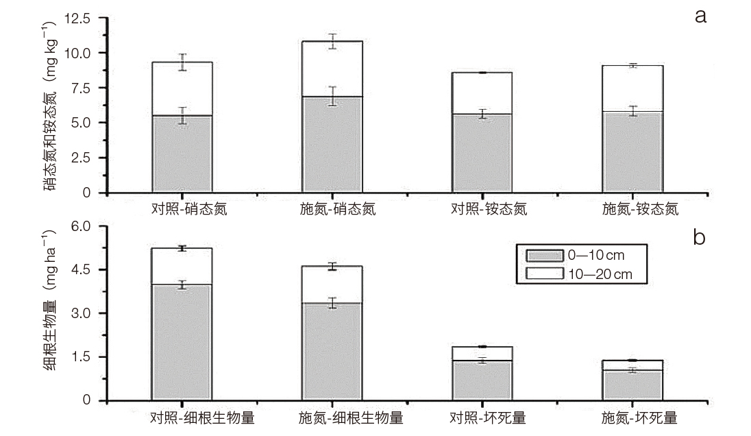 图11土壤硝态氮和铵态氮(a)以及细根生物量和坏死量(b)