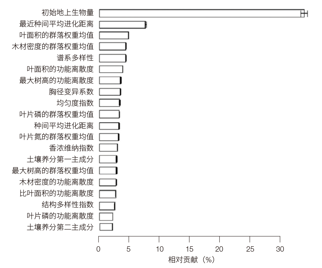 基于长白山温带森林样地 10 年的长期监测数据,使用基于机器学习和分类回归树的推动回归树模型(BRT)分析回答了“不同因子对生产力形成的贡献”这一科学问题,量化了生物多样性(包括分类、谱系和功能多样性)、林分结构特征(包括基于胸径的香农-威纳指数和变异系数)、功能性状组成以及初始生物量和土壤养分对生产力的相对贡献。结果发现:温带典型森林生产力主要受初始生物量的影响。植被数量对温带天然林生产力的影响大于植物质量和土壤养分,性状组成和土壤养分对生产力的相对贡献随着森林群落演替的升级而降低,生物多样性和植被数量的相对贡献则随之升高(图 3)。