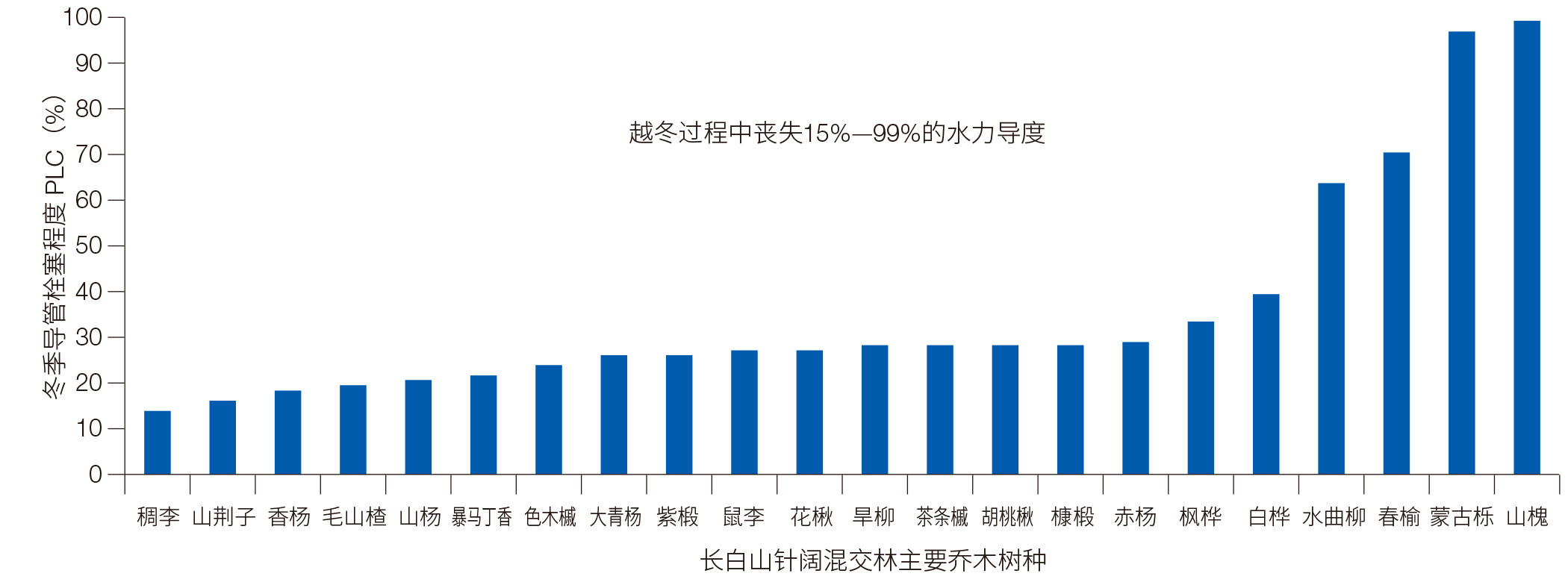 图4长白山针阔混交林常见树种冬季枝条木质部导水率丧失的百分比