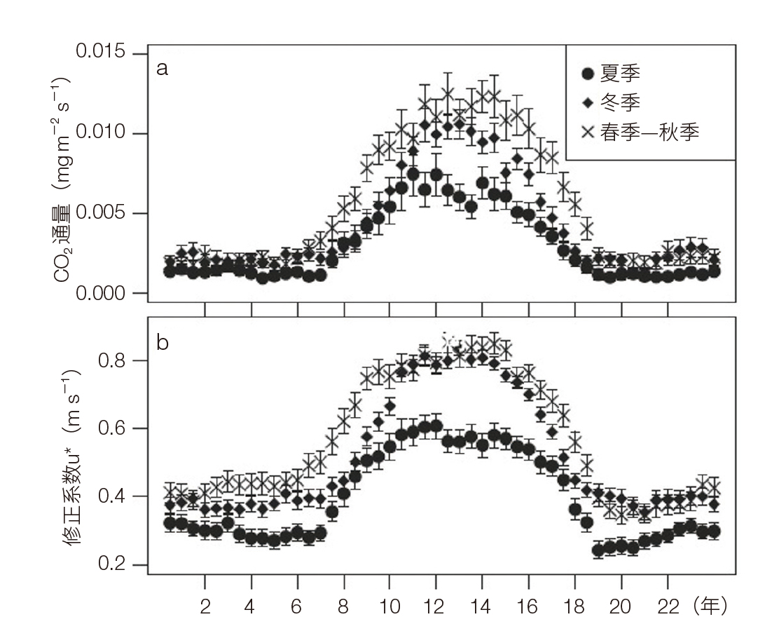 依据连续 11 年 CO2通量观测数据(图 1),针对传统涡度相关方法忽略湍流方程组二阶闭合项的弊端,提出了压力脉动是造成森林生态系统长期碳收支的重要偏差源,并给出了静压脉动通量修正方法。在考虑大气静压脉动的影响后,碳通量的计算精度可提高 15%。得出长白山原始老龄阔叶红松林生态系统仍然是大气的持续碳汇,具有持续固碳能力,其碳汇强度为 170—290 g C m-2yr-1。提出固碳潜力参照原生稳定群落固碳假设,获“973”项目“天然森林和草地土壤固碳功能与固碳潜力研究”支持。根据这些科学数据推算,我国温带森林固碳潜力可抵扣全国 1982—2003 年均碳排放总量的 9%—21%。上述研究汇总的成果“长白山老龄阔叶红松林碳汇功能研究”获吉林省自然科学成果奖。