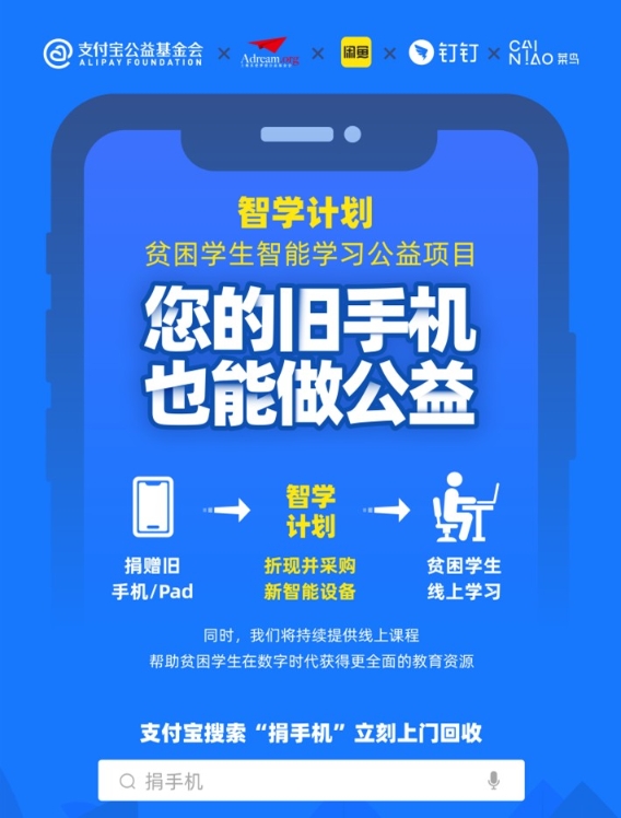 中国网/中国发展门户网讯 日前,支付宝公益基金会联合上海真爱梦想公益基金会、闲鱼、钉钉、菜鸟共同发起“智学计划”,号召公众捐赠闲置的旧手机或平板电脑。公众进入支付宝APP搜索“捐手机”即可进入捐赠页面,旧手机经过专业机构估价并回收,筹得资金将统一用于采购全新的平价智能设备,并配备流量卡,发放给缺乏智能设备的建档立卡贫困家庭的在读中小学生,引导他们使用优质教育APP学习。