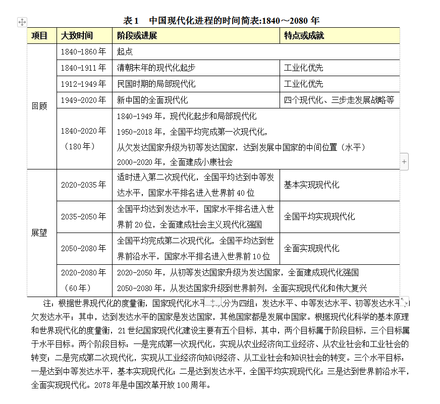 何传启说,中国现代化进程的时间简表包括回顾和展望两个部分。前者展现中国现代化建设的进程和成就,后者展望中国现代化建设的目标和前景。前者覆盖的时间范围为1840~2020年,后者覆盖的时间范围为2020~2080年。