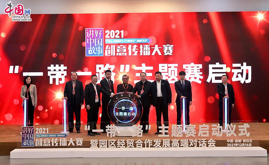 图为2021“讲好中国故事”创意传播大赛“一带一路”主题赛启动仪式。主题赛面向“一带一路”共建国家和地区、国内外企业、各类机构和个人,征集体现经济融合、文化互容、民心相通的真实故事,向国际社会讲好共建“一带一路”和人类命运共同体的故事。白桂斌/摄