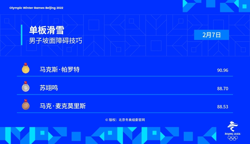 2014年索契冬奥会单板滑雪-男子坡面障碍技巧美国选手库兹伯格以93.50分夺得金牌;2018年平昌冬奥会美国选手雷蒙德-杰拉德以87.16分夺得金牌;2022年北京冬奥会加拿大选手马克斯·帕罗特以90.96分获得金牌。