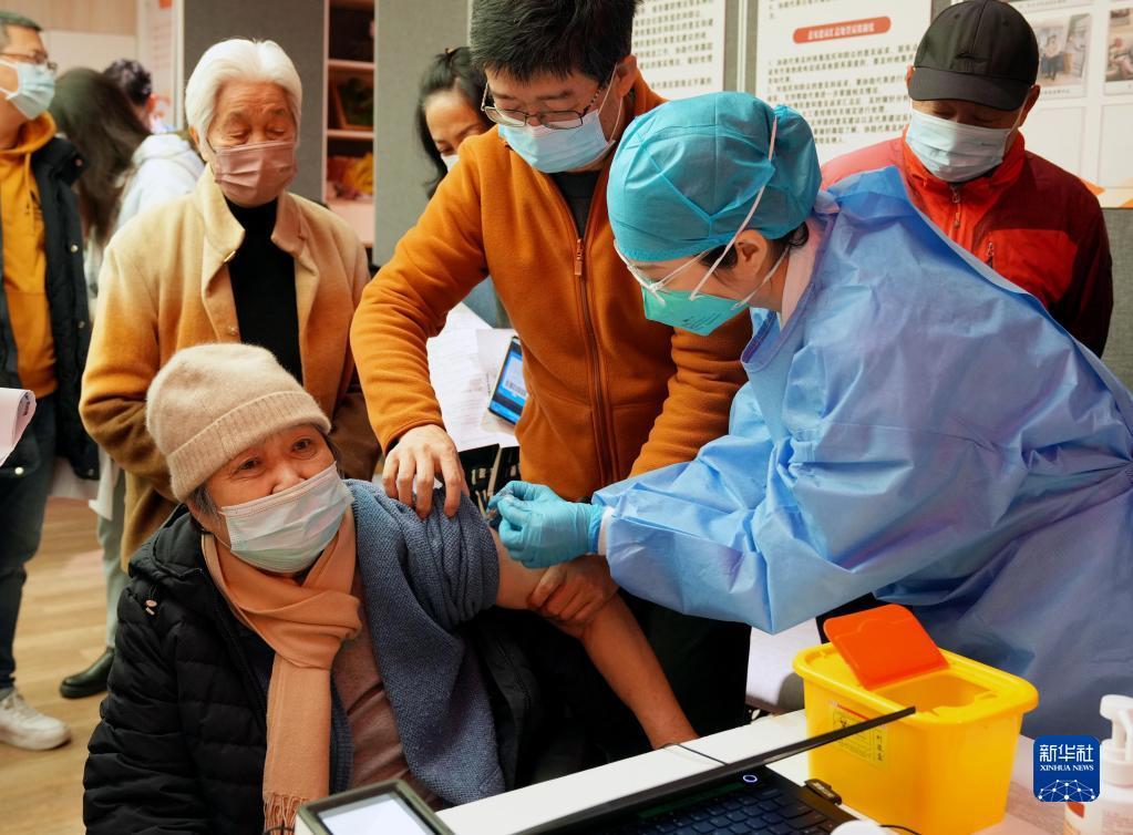 12月9日,在上海市黄浦区打浦桥街道大同居委会,接种小分队的护士在为老年人接种新冠疫苗。新华社记者 刘颖 摄