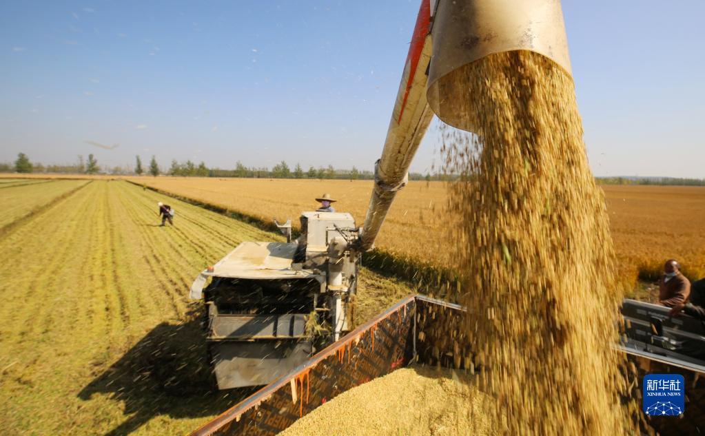 10月23日,在山东省临沂市郯城县郯城街道,农民将收获的水稻装车。新华社发(张春雷 摄)
