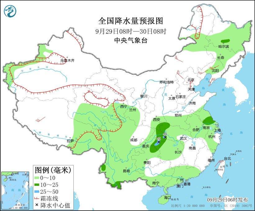 9月29日08时至30日08时,新疆西部沿山地区、内蒙古东北部、黑龙江大部、吉林大部、辽宁中部、青海南部、甘肃西南部、西藏东部、川西高原、重庆、陕西南部、云南、贵州西部和北部、湖南中北部、湖北大部、河南中南部、安徽、江苏、上海、浙江大部、广东、广西东部和南部、海南岛等地有小到中雨,其中,湖北西南部、重庆东南部等地部分地区有大雨(25~45毫米)。西藏南部、内蒙古中东部、辽宁中西部、辽东半岛、河北北部、天津等地部分地区有4~6级风(见图1)。