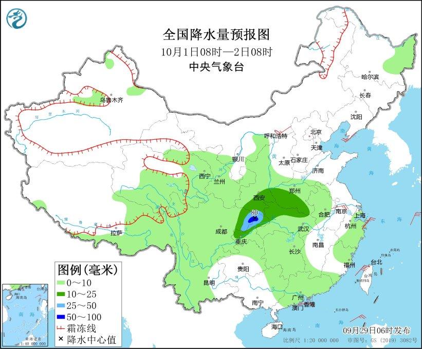 10月1日08时至2日08时,陕西东南部、四川东北部、重庆北部和西部、湖北北部、河南西部和南部等地部分地区有中到大雨,其中,四川东北部、重庆北部等地局部地区有暴雨(50~80毫米)。内蒙古中部、辽东半岛、浙江东部沿海等地部分地区有4~5级风(见图3)。
