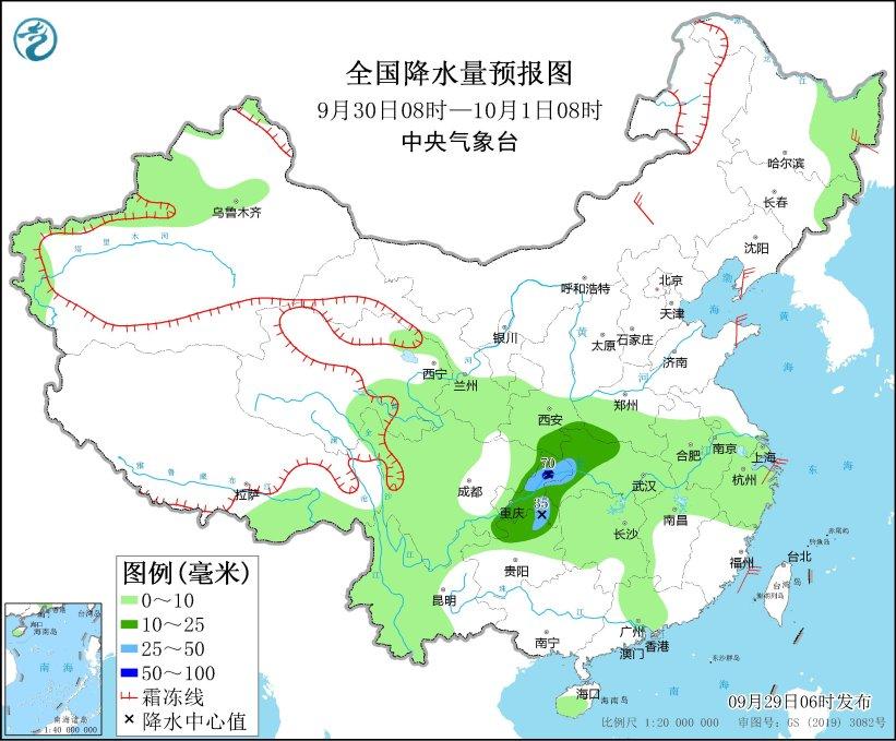 图2 全国降水量预报图(9月30日08时-10月1日08时) 图片来源:中央气象台网站