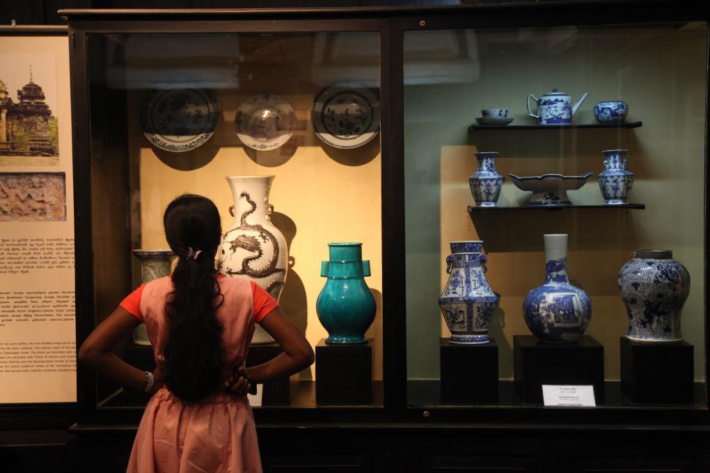 2014年9月15日,在斯里兰卡首都科伦坡,游客参观斯里兰卡国家博物馆展出的当地出土的中国古代瓷器,一些中国外销瓷器上还绘有南亚、伊斯兰风情,与郑和碑共同见证着古代海上丝绸之路和中斯友好交往的源远流长。 新华社记者冯武勇摄