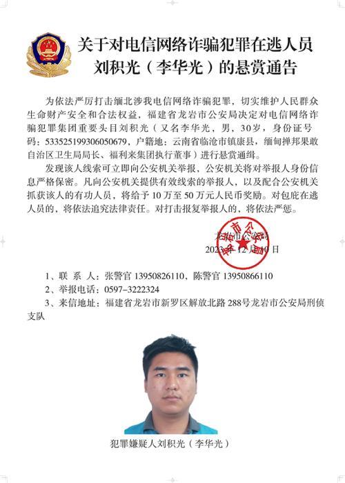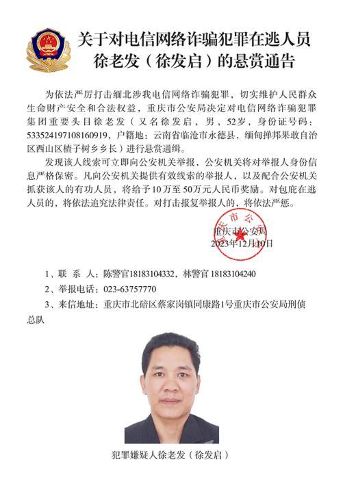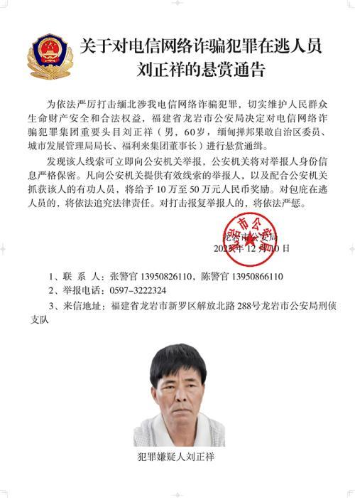 为依法严厉打击缅北涉我电信网络诈骗犯罪,切实维护人民群众生命财产安全和合法权益,辽宁省大连市公安局决定对白所成、白应苍(又名李云晨)、白应兰(又名李梦娜)进行公开悬赏通缉;福建省泉州市公安局决定对魏怀仁、魏榕(又名陈榕)、魏青松(又名杨松)进行公开悬赏通缉;福建省龙岩市公安局决定对刘正祥、刘积光(又名李华光)、刘正茂进行公开悬赏通缉;重庆市公安局决定对徐老发(又名徐发启)进行公开悬赏通缉。