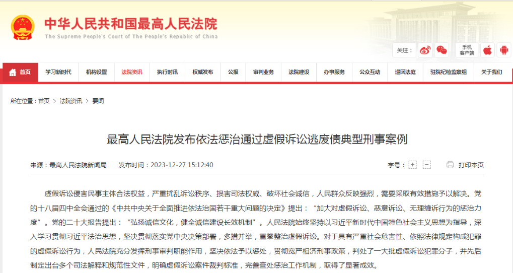 12月27日,最高人民法院发布依法惩治通过虚假诉讼逃废债典型刑事案例,充分发挥司法裁判的规范指引和行为导向作用,明确相关行为的法律后果,有效回应社会关切。