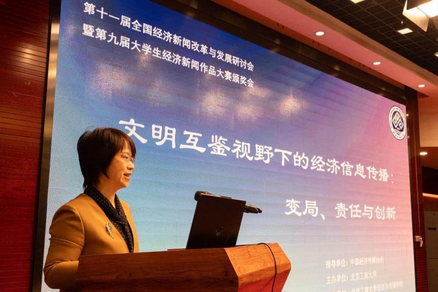 北京工商大学党委书记沈千帆在致辞中指出,全国经济新闻改革与发展研讨会及大学生经济新闻作品大赛是北京工商大学语言与传播学院深耕二十载的品牌活动。历经二十年的坚守与发展,该活动已成长为国内经济新闻领域“学界对话业界、前辈扶持后辈”的重要纽带。作为市属高水平研究型大学,北京工商大学依托深厚商科底蕴,走出了一条“新闻+经济+技术”的特色化新闻传播学科发展之路。他强调,优秀的经济新闻既要准确记录时代经济脉搏,更要深刻解读发展逻辑、有效凝聚社会共识。面对服务国家和首都战略、用国际化表达讲好中国经济故事等时代命题,本届研讨会的主题与分议题设置,有助于汇聚学界与业界智慧,共同探索破解之道。