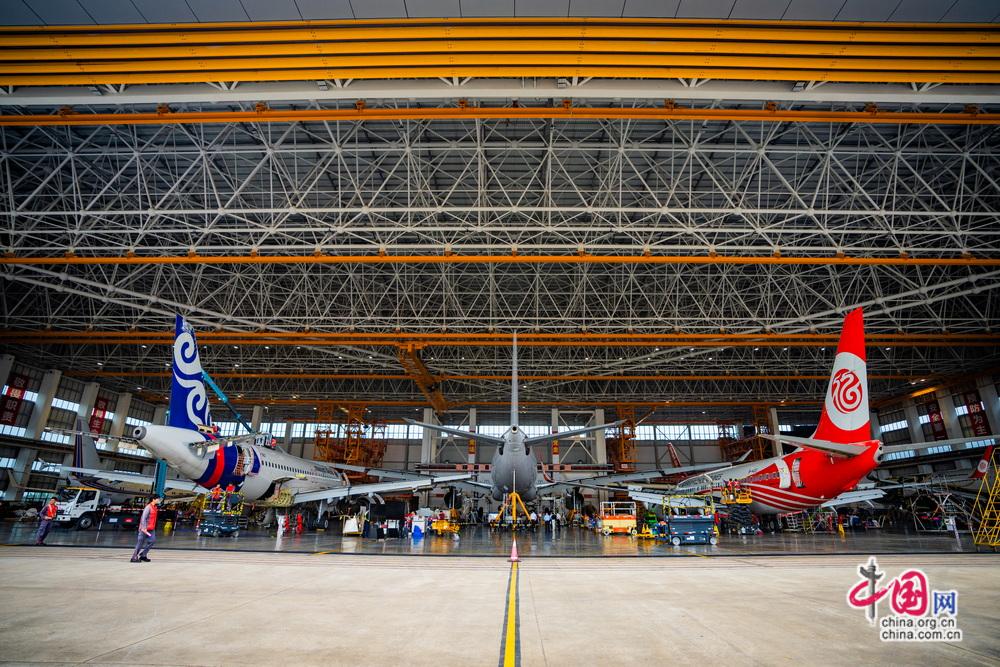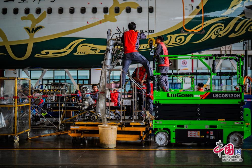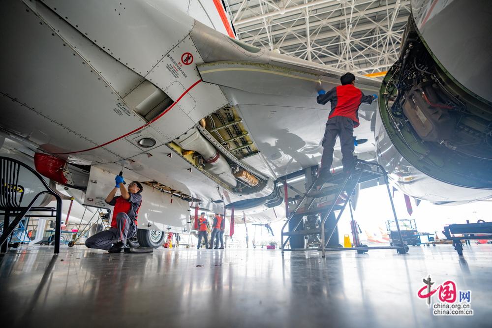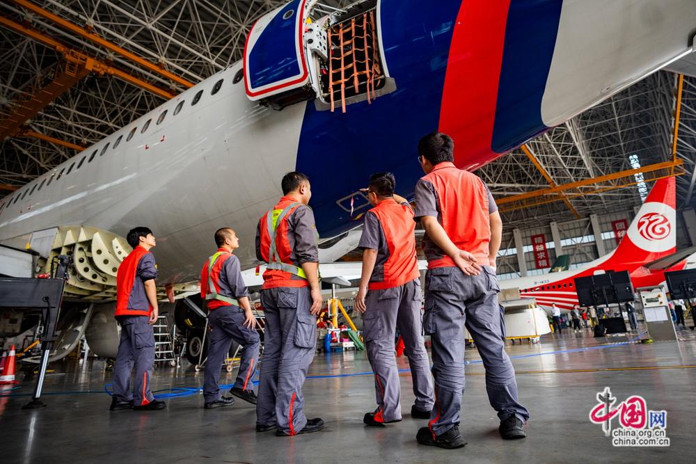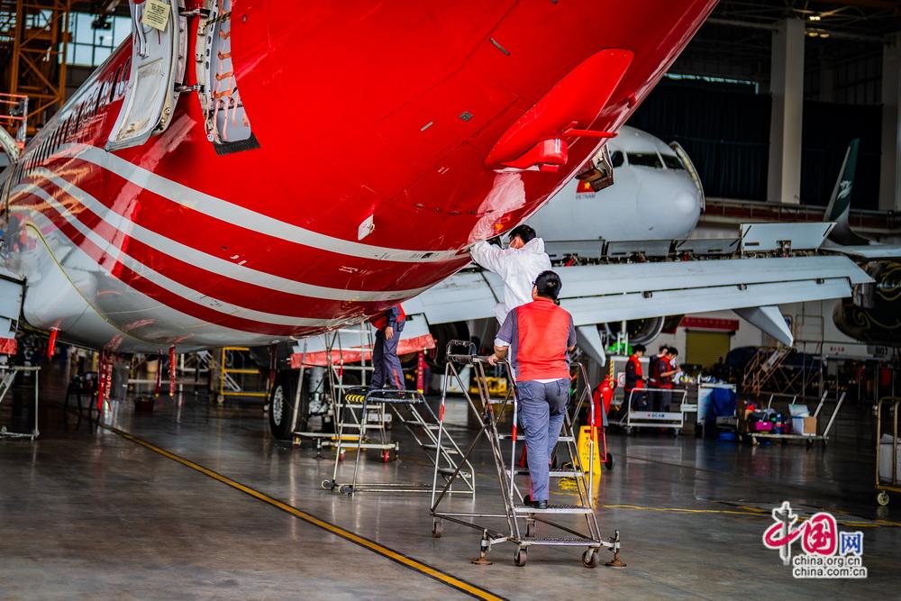 海口空港综保区一站式维修基地内工人正在检修飞机。中国网记者 郑亮摄