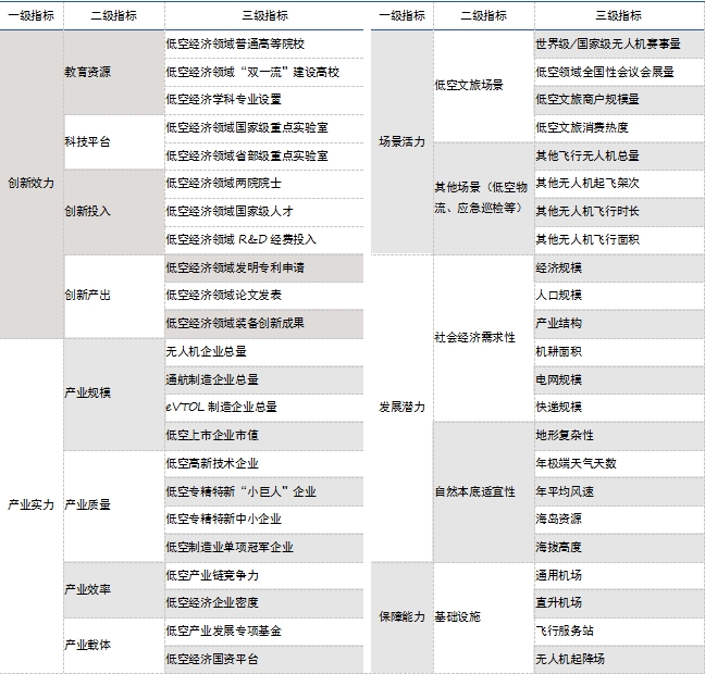 产业实力。低空产业是低空经济发展的基础支撑。选取产业规模、产业质量、产业效率和产业载体,构建了4个二级指标和16个三级指标,综合反映低空经济的产业实力。