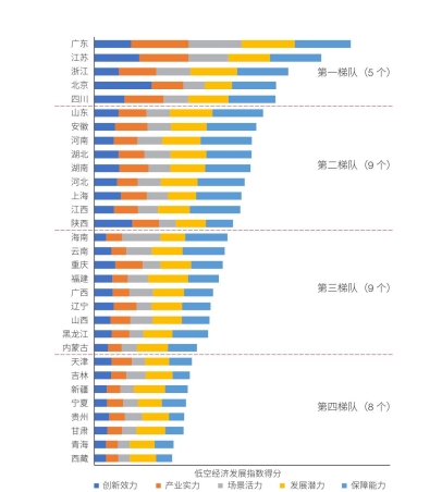 第一梯队:包括广东、江苏、浙江、北京和四川5个省(直辖市),是我国低空经济发展的引领区域,主要位于珠三角、长三角、京津冀和成渝城市群地区,在低空经济发展的创新效力、产业实力、场景活力、发展潜力和保障能力5个维度普遍具有较高水平。