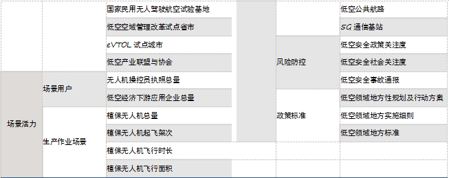 场景活力。“低空+”场景应用是低空经济发展的重要形态,选取了场景用户、生产作业场景、低空文旅场景及其他场景4个二级指标和14个三级指标,综合刻画低空经济的场景活力。