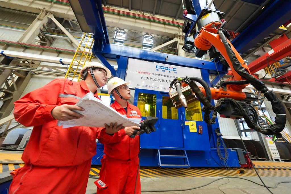 在海油工程天津智能制造基地,工程师正在调试设备。(海油工程供图)