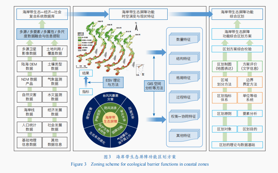 鉴于海岸带生态屏障建设的重要性和紧迫性,以及海岸带的区位特殊性和受多重应力复合胁迫的复杂性,海岸带生态屏障功能区划应在强调地理学“综合性”特征与陆海连续体“整体论”等科学方法论的前提下,着重开展生态屏障功能综合评价体系、时空演变特征、动态响应区划等方面的研究。具体包括:整合海岸带生态-经济-社会-气候-灾害多源、多要素时空数据,调查海岸带生态屏障本底状况和时空演变特征,明晰其现状空间格局和历史演变轨迹。集成海岸带生态屏障功能多学科、多要素数据和模型方法,动态精准量化生态屏障功能,将供给方与需求方进行集成分析,重点评价生态屏障功能的不可替代性和关键生态系统贡献度,创新综合评价模型,构建多目标、多层级评价体系,开展海岸带生态屏障功能综合评价。多时空尺度识别并解析海岸带生态屏障功能的权衡-协同关系,评估和定位海岸带生态屏障核心功能区(带),并结合气候变化、水沙输移、生态过程及人类活动等多重因素,在融合空间异质性分析与生态屏障功能权衡-协同研究基础上,构建“功能类型-空间格局-过程特征”三位一体的海岸带生态屏障功能统一区划标准和动态特征区划方案(图3)。