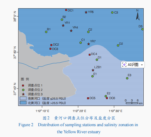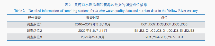 本文所采用的黄河口实测数据主要来自中国科学院烟台海岸带研究所航次及地方部门协调数据,包括2016—2019年5月、8月和10月,2022年2月、4月、5月、6月、7月、8月、11月在黄河口开展的现场水质监测数据(盐度、叶绿素a等参数)和表层水样中的硝酸盐、亚硝酸盐、氨氮和PO4-P浓度数据,调查点位详见图2和表2。DIN浓度为硝酸盐、亚硝酸盐和氨氮的浓度之和。黄河三角洲垦利区2016—2019年、2022年渔业产量数据来自历年《东营统计年鉴》。黄河全年入海径流量及利津站年径流量和输沙量数据来自《中华人民共和国水文年鉴黄河流域水文资料》和《黄河水资源公报》。通过文献检索获取了黄河口利津站1981—2018年DIN和PO4-P的浓度数据,根据黄河利津站年径流量估算了近年来DIN和PO4-P的入海通量,以揭示河流输入对黄河口氮、磷分布的影响。