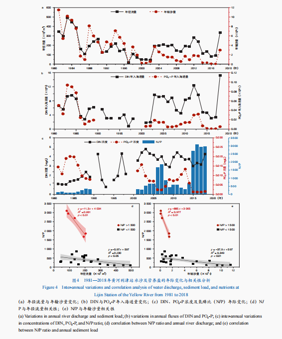 鉴于陆源输入对黄河口氮、磷分布及氮磷比具有显著影响,本文对黄河利津站径流量、输沙量,以及DIN、PO4-P入海通量进行了分析。1981—2018年,黄河下游年径流量和输沙量同步下降(R2=0.57,p < 0.01)(图4a);在入海通量上,2002年以后,径流量呈波动上升趋势,DIN通量也随之增加,但PO4-P通量不仅受径流量影响(R2=0.75,p<0.01),还与输沙量密切相关(R2=0.66,p<0.01),总体呈下降趋势(图4b)。在浓度和比值上,2002年以后,DIN浓度震荡波动,但PO4-P浓度有所下降,这些变化导致黄河下游氮磷比异常偏高,平均值超过850∶1(图4c),远高于黄河口区域的水平。氮磷比与黄河水沙量均存在显著负相关关系(图4d和e),说明由于黄河来水来沙减少造成稀释效应和吸附效应减弱,而流域人为活动产生的氮排放仍在增强、磷排放有所减弱,导致黄河口氮磷比近年来显著增加。由此可见,黄河水沙变化深刻影响着黄河口的氮磷分布格局,这些要素沿盐度梯度的迁移与转化,塑造了河口的氮磷分布,进而主导浮游生物的生长繁殖过程,最终重塑该区域的生物多样性和生态系统功能的演变。