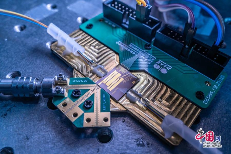 研究团队制备的超宽带光电融合芯片。北京大学供图