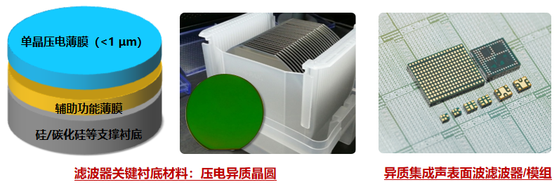 上海微系统所“5G/6G移动通信用射频声波滤波器关键衬底技术及其产业化”获科技攻关奖,图为滤波器关键衬底材料——压电异质晶圆和异质集成声表面波滤波器/模组。