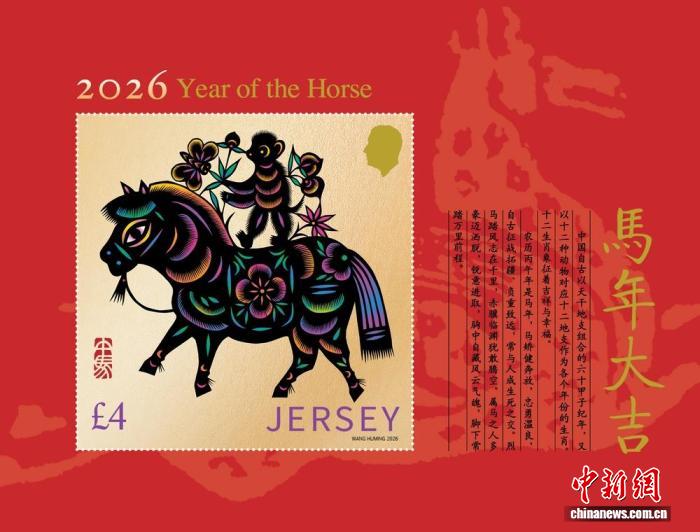图为泽西岛以“马上封侯”为主题的2026马年邮票。(图片来源:Jersey Stamps官网)
