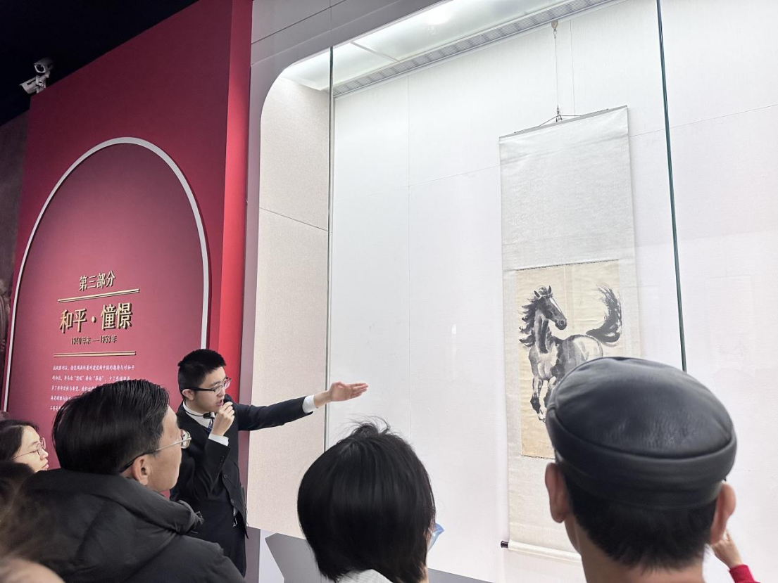 2026年2月19日,徐悲鸿纪念馆讲解员为现场观众解读画作背后的故事。新华网记者 李晏 摄