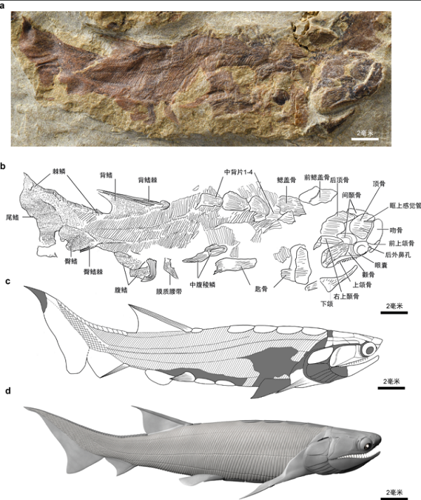 图为始骨鱼化石及复原。a.始骨鱼照片;b.始骨鱼标本线图;c.始骨鱼复原线稿;d.始骨鱼三维复原灰模。