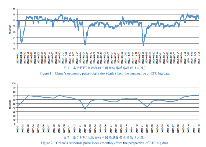 “十四五”时期,我国经济实现了质的有效提升和量的合理增长,构建新发展格局、建设全国统一大市场等重大战略深入推进,现代物流体系建设取得历史性成就,社会物流总费用与国内生产总值(GDP)比率持续下降,物流“筋络”的畅通为经济循环的整体性、协同性持续增强提供了有力支撑。在此背景下,如何超越传统宏观总量观察,依托微观大数据精准感知经济运行的动态变化与结构性特征,成为提升宏观治理能力、推动经济高质量发展的重要课题。近年来,学术界与实践部门日益重视利用大数据进行经济监测。现有研究主要集中在利用卫星灯光数据、搜索引擎指数、移动通信信令数据等进行宏观经济预测或区域经济活动评估。在交通物流领域,部分研究开始利用港口吞吐量、货运平台数据等分析供应链状况。然而,系统性地利用覆盖全域、高频实时的ETC通行数据,构建一个符合完整经济运行逻辑的综合性监测指数,并将其用于解读全国层面经济脉动特征的研究尚不多见。