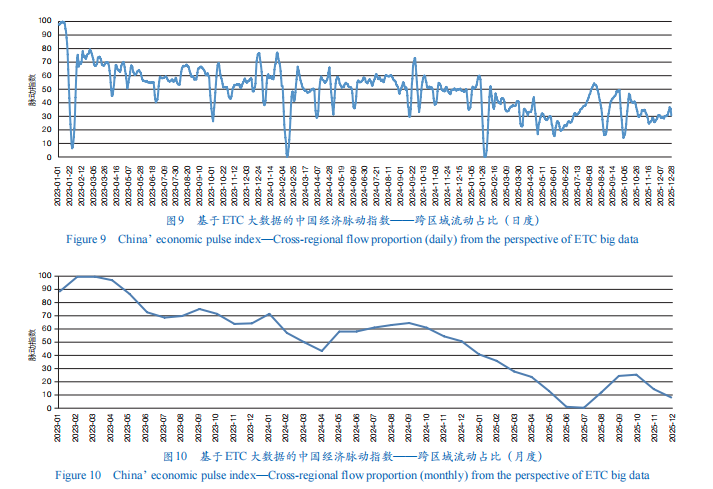 跨区域流动占比指标主要反映人员、货物的跨区域配置效率,衡量区域间经济联系紧密程度。跨省通行车辆占总通行量的比例从2023年高点持续下滑,2025年末降至监测期最低(图9和10)。节假日高峰效应依然存在,但年度中枢不断下移,暗示跨区域要素流动强度减弱,省内或区域内循环比重上升。