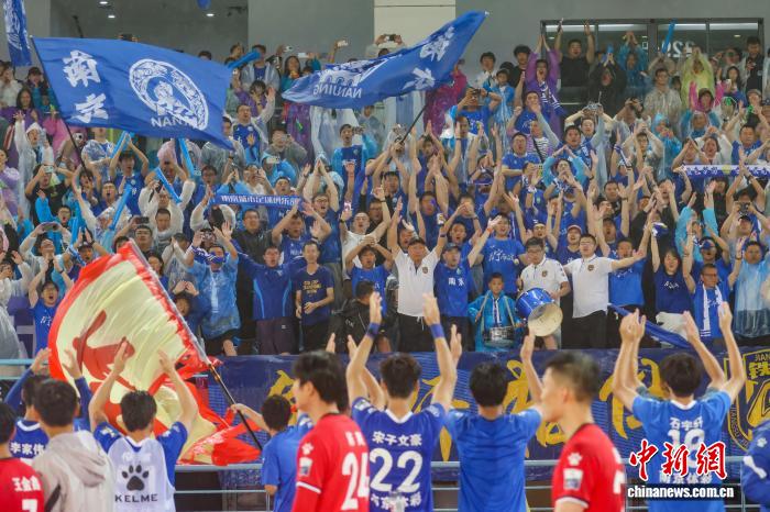 2025年6月21日晚,江苏常州,球迷在雨中为获胜的南京队球员加油。中新社记者 泱波 摄