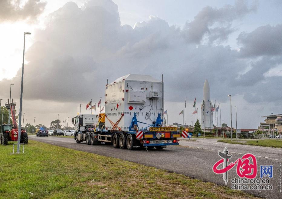图为 “微笑卫星”包装箱从库鲁码头运输到发射场(图片来源:ESA)