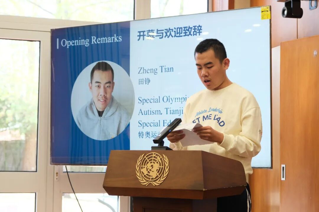 图为特奥运动员代表、天津市宁河区特殊教育学校田铮致辞。(供图:联合国教科文组织)