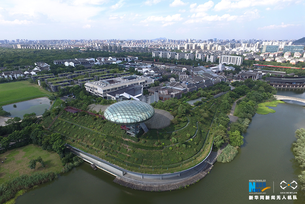 中国湿地博物馆——扎根西溪深处的“绿丘”。博物馆设计以“绿丘”作为表现载体,将整个建筑巧妙地与山丘融为一体,造型独树一帜。山丘表面设有洞穴似的采光井,山丘上部设有高达30米的观光塔,似向外挑出的圆盘,能轻易俯瞰西溪湿地的全景,成为西溪国家湿地公园中唯一的标志性建筑。博物馆分“湿地与人类”、“中国湿地”、“西溪湿地”三大展览内容,从资料图片到亲身体验,结合多媒体等科技手段,为参观者创造学习与互动空间。图为航拍下的中国湿地博物馆。新华网祝立铭摄