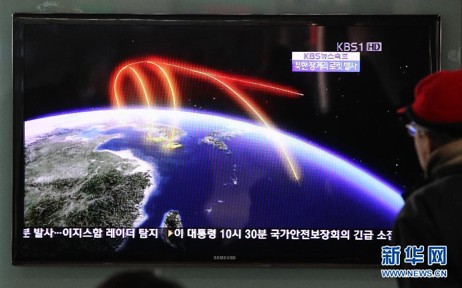 12月12日,在韩国首尔,人们观看韩国媒体报道朝鲜发射火箭的新闻。据韩国联合通讯社12日报道,朝鲜当天在平安北道铁山郡东仓里火箭发射基地发射一枚火箭。火箭发射不久,即被韩国军舰雷达探测到。据朝中社12日报道,朝鲜“光明星3号”卫星发射成功。 新华社发(朴真熙摄)