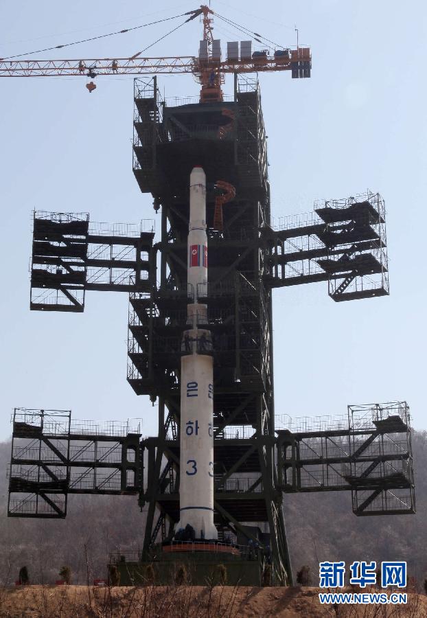 12月12日,据外电报道,朝鲜当天发射一枚火箭。朝鲜方面目前没有相关报道。这是2012年4月8日在朝鲜平安北道铁山郡东昌里的“西海卫星发射场”拍摄的“银河3号”运载火箭。新华社记者张利摄