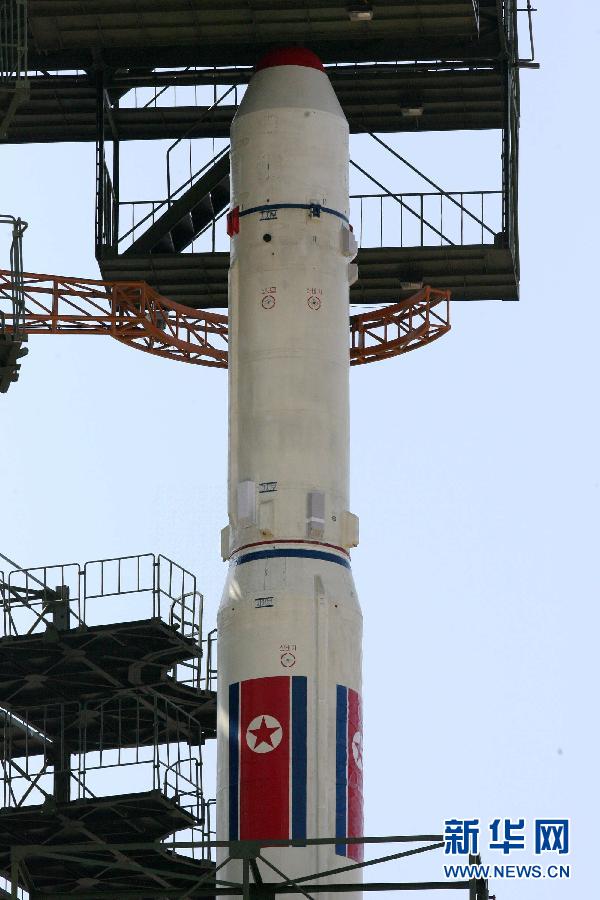 12月12日,据外电报道,朝鲜当天发射一枚火箭。朝鲜方面目前没有相关报道。这是2012年4月8日在朝鲜平安北道铁山郡东昌里的“西海卫星发射场”拍摄的“银河3号”运载火箭。新华社记者张利摄