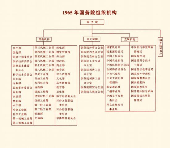1966~1975年:“文革”中,政府机构发生非正常的大变动。1970年,国务院的79个部门撤销合并为32个,其中13个还由部队管理,达到建国以来中央政府机构数的最低点。1975年,邓小平主持国务院工作,并对各领域进行整顿,与之相适应,国务院工作部门恢复到52个。