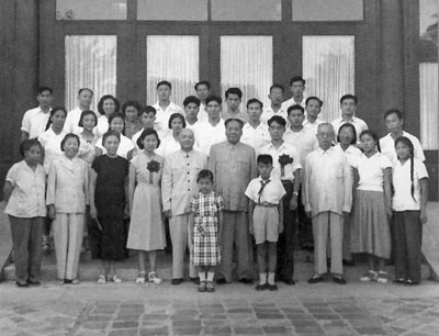 1959年9月,毛泽东参加李敏、孔令华的婚礼,前排左二为邓颖超、左三为蔡畅、左五为孔从洲。