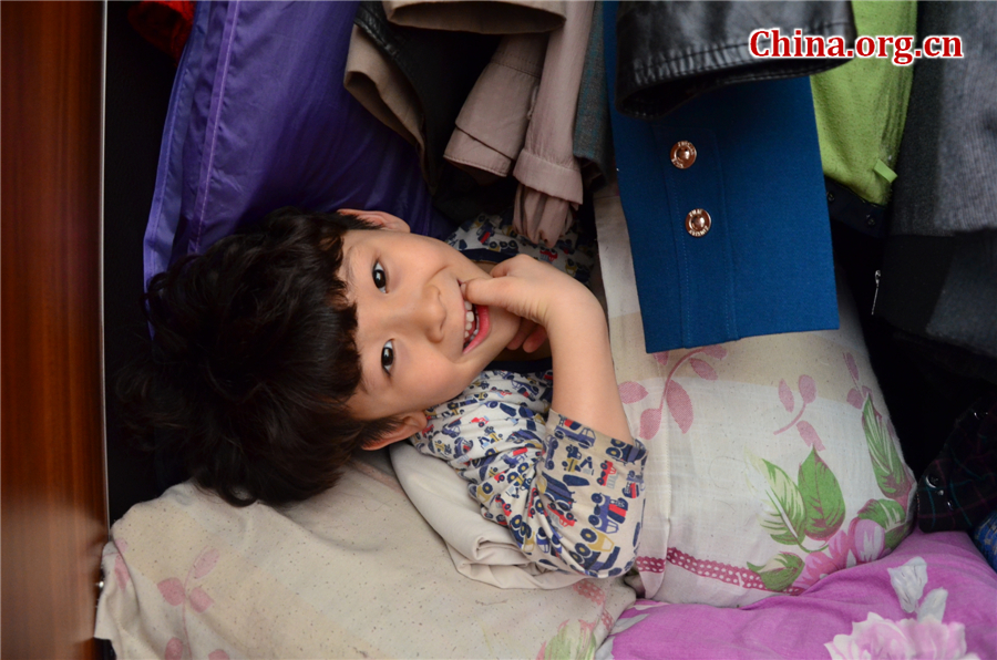 虽然爷爷家有了更为宽敞的娱乐空间,但小家伙依然有钻柜子的情节,一踩凳子便熟练的钻进了新衣柜,瞬间便把自己埋没在衣服和被褥之中。中国网弓迎春 摄