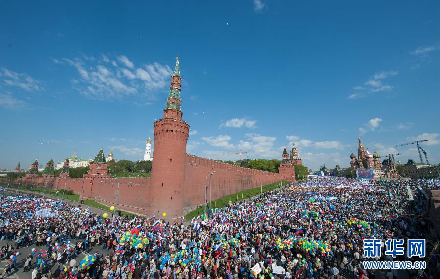 5月1日,在俄罗斯首都莫斯科,人们聚集在红场附近。 当日,逾10万人参加了莫斯科市中心的五一劳动者大游行。 新华社记者戴天放摄