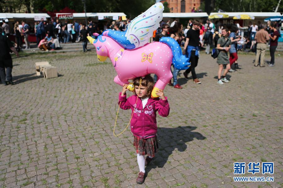 5月1日,在德国首都柏林,一个小女孩在“五一”国际劳动节的庆祝活动中拿着卡通气球。 当日,德国首都柏林举行各种活动,庆祝和纪念 “五一”国际劳动节,市民尽享节日的欢乐时光。 新华社记者张帆摄