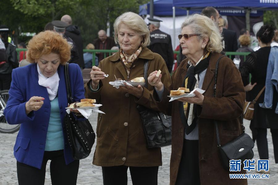 5月1日,在罗马尼亚首都布加勒斯特,三名女士就着面包品尝传统烤肉肠“糜奇”。“糜奇”是一种用猪、牛肉馅等加上特殊调料配制而成的烤肉肠,被认为是该国最具特色的传统美味。今年“五一”国际劳动节布加勒斯特放假四天,很多市民走出家门,参与街区组织的各种活动。新华社发(佩特雷斯库摄)