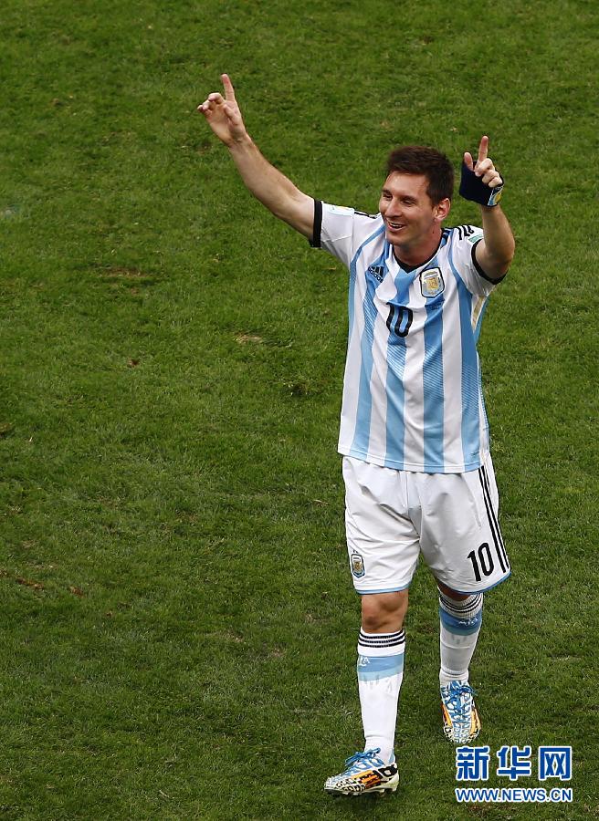 7月5日,阿根廷队球员莱梅西在比赛后庆祝获胜。当日,在巴西巴西利亚马内·加林查国家体育场进行的2014年巴西世界杯四分之一决赛中,阿根廷队以1比0战胜比利时队,晋级四强。新华社记者刘彬摄