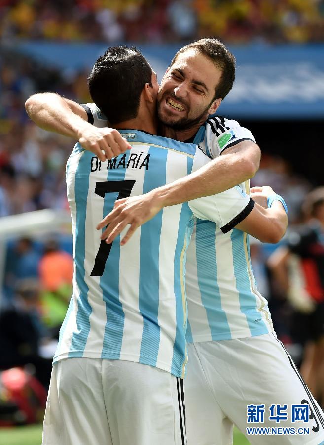 7月5日,阿根廷队球员贡伊瓜因(右)和队友庆祝进球。当日,在巴西巴西利亚马内·加林查国家体育场进行的2014年巴西世界杯四分之一决赛中,阿根廷队对阵比利时队。新华社记者刘大伟摄