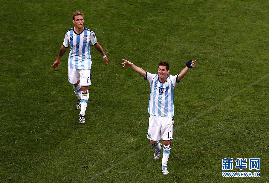 7月5日,阿根廷队球员莱梅西(右)、卢比利亚在比赛后庆祝获胜。当日,在巴西巴西利亚马内·加林查国家体育场进行的2014年巴西世界杯四分之一决赛中,阿根廷队以1比0战胜比利时队,晋级四强。新华社记者刘彬摄