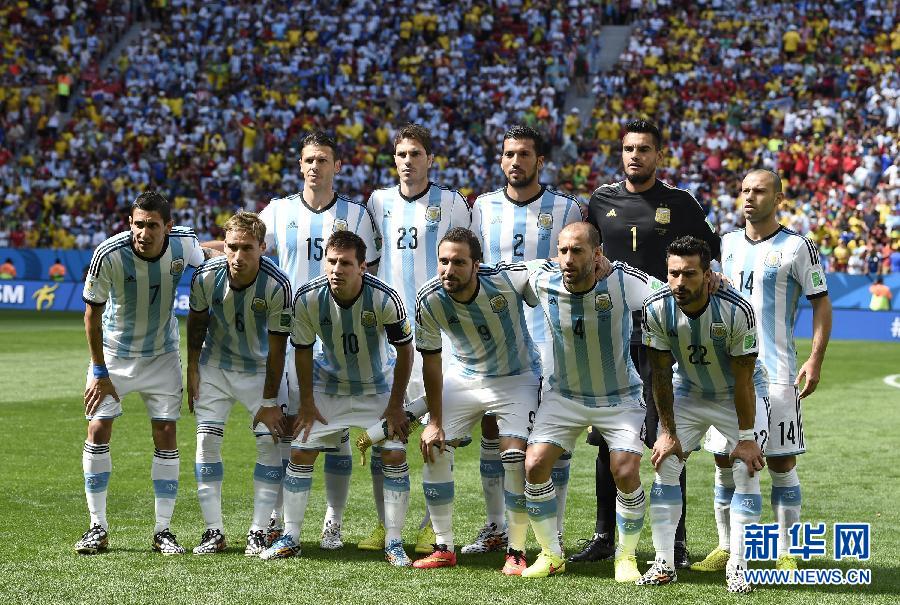 7月5日,阿根廷队首发阵容。当日,在巴西巴西利亚马内·加林查国家体育场进行的2014年巴西世界杯四分之一决赛中,阿根廷队对阵比利时队。 新华社记者戚恒摄