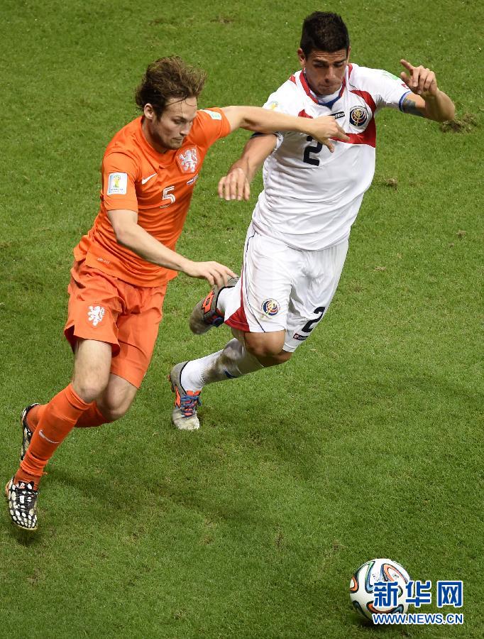 7月5日,荷兰队球员达布林德(左)与哥斯达黎加队球员约 阿科斯塔在比赛中争抢。 新华社记者杨磊摄